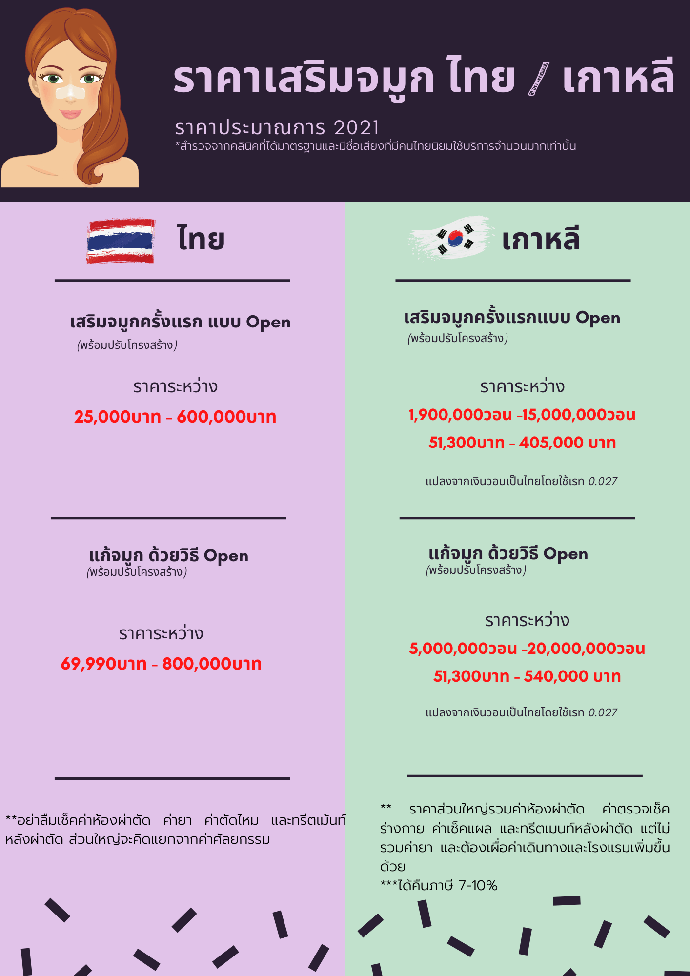 ไม่ว่าจะทำจมูกที่ไทยหรือเกาหลี ล้วนแล้วแต่มีราคาจากหลักพันบาท ถึง หลักหลายแสนบาทด้วยกัน ขึ้นอยู่กับระดับฝีมือ และความโด่งดัง และเป็นหมอที่ต้องการของใครหลายๆคนด้วยหรือปล่าว