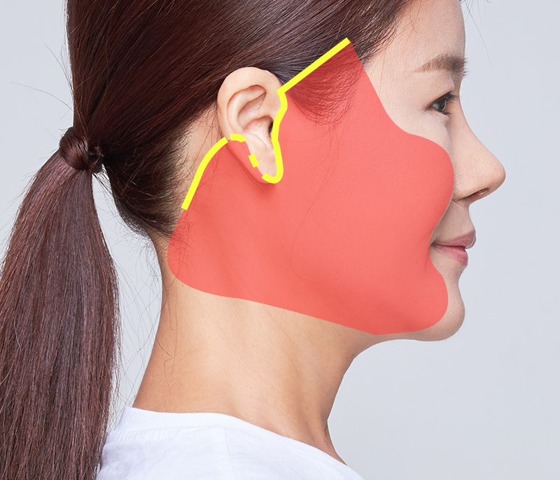 - ดึงยาวตั้งแต่หน้าหู ไปจนถึงหลังใบหู